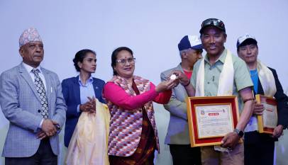 The government also bestowed various awards upon the climbers. Mr. Sanu Sherpa received the Sagarmatha National Award, while Mr. Pasang Dawa Sherpa all (27-time Mount Everest summiteers), Mr. Kishor Adhikari, and Ms. Pasang Lhamu Sherpa were felicitated with the Tenzing Hillary Award.