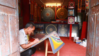 A Thanka artist engaged in Thanka painting at Changu Narayan, Bhaktapur. Thanka paintings are one of the tourism products of Nepal. This is a Tibetan tradition. It is considered to be one of the manual arts and crafts of Nepal. Thanka painting is done on a canvass of cotton clothes…